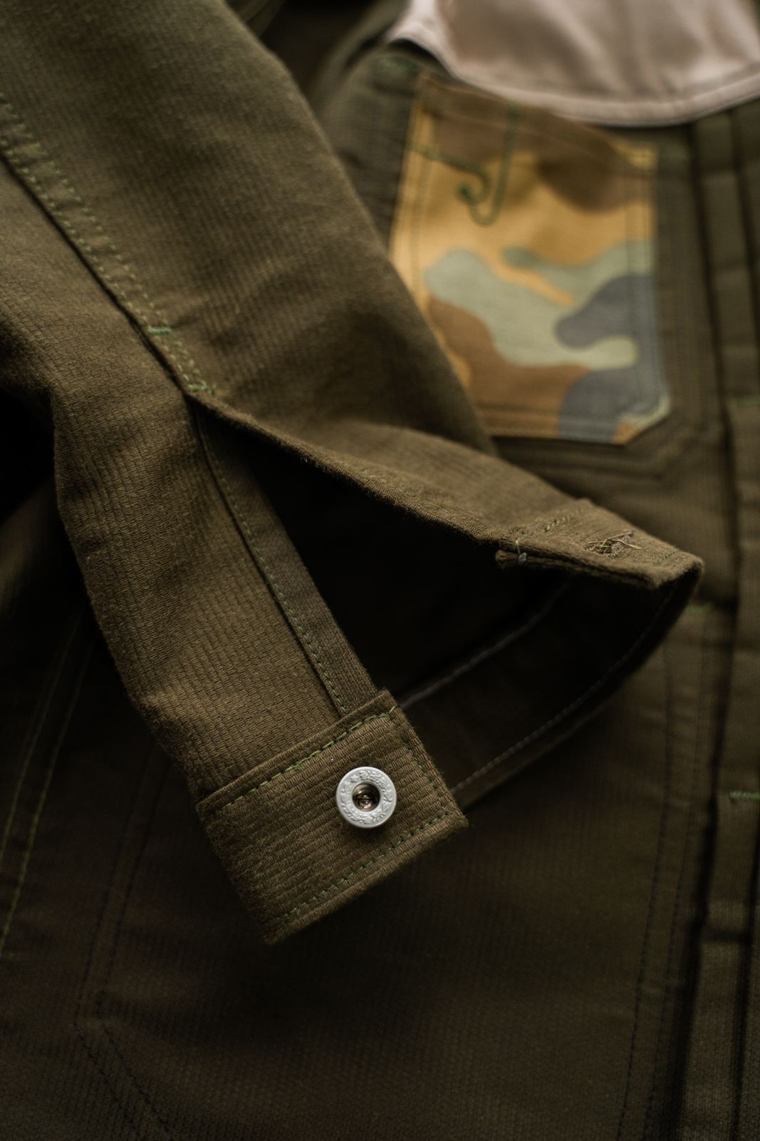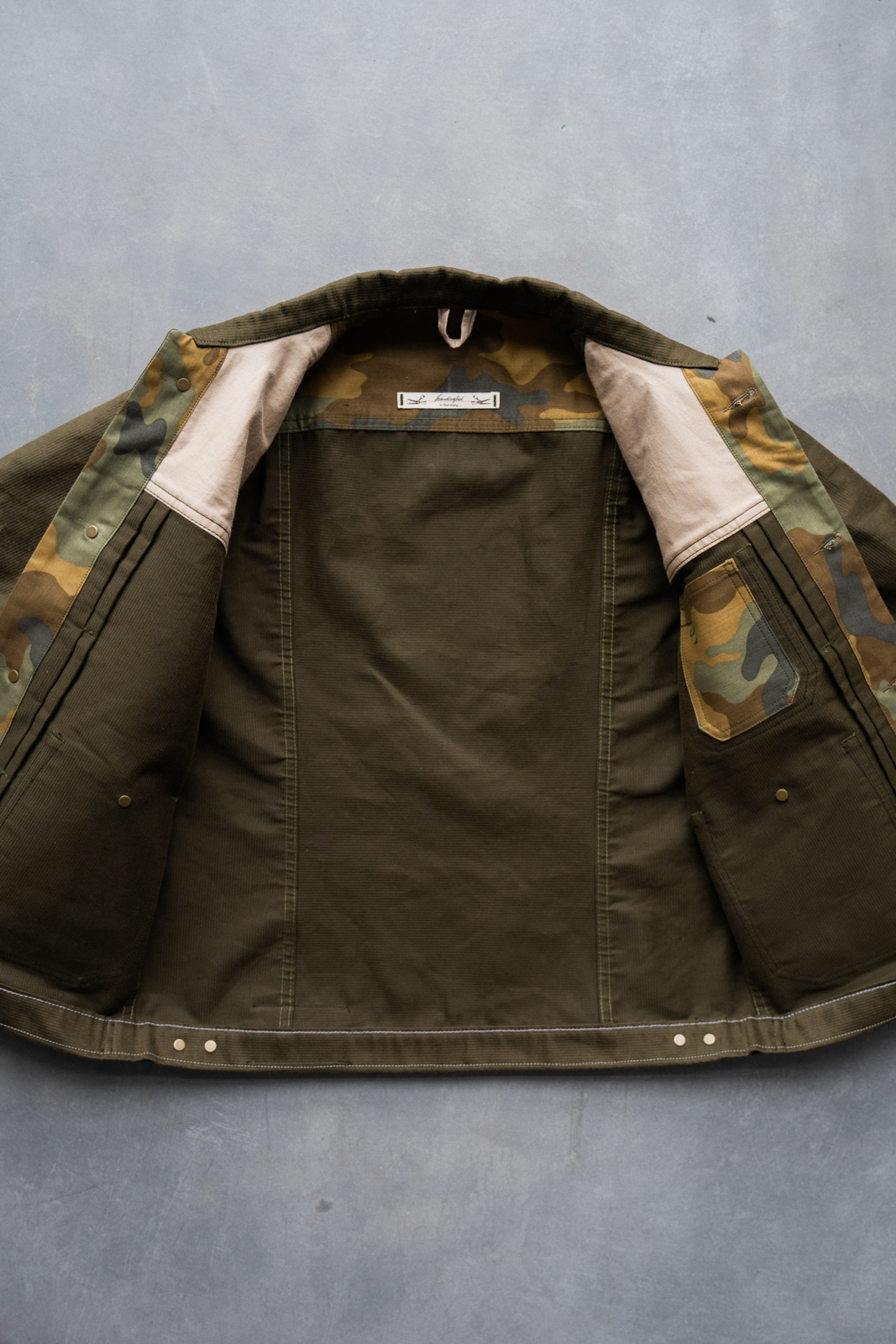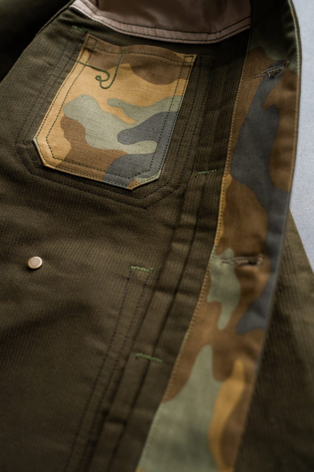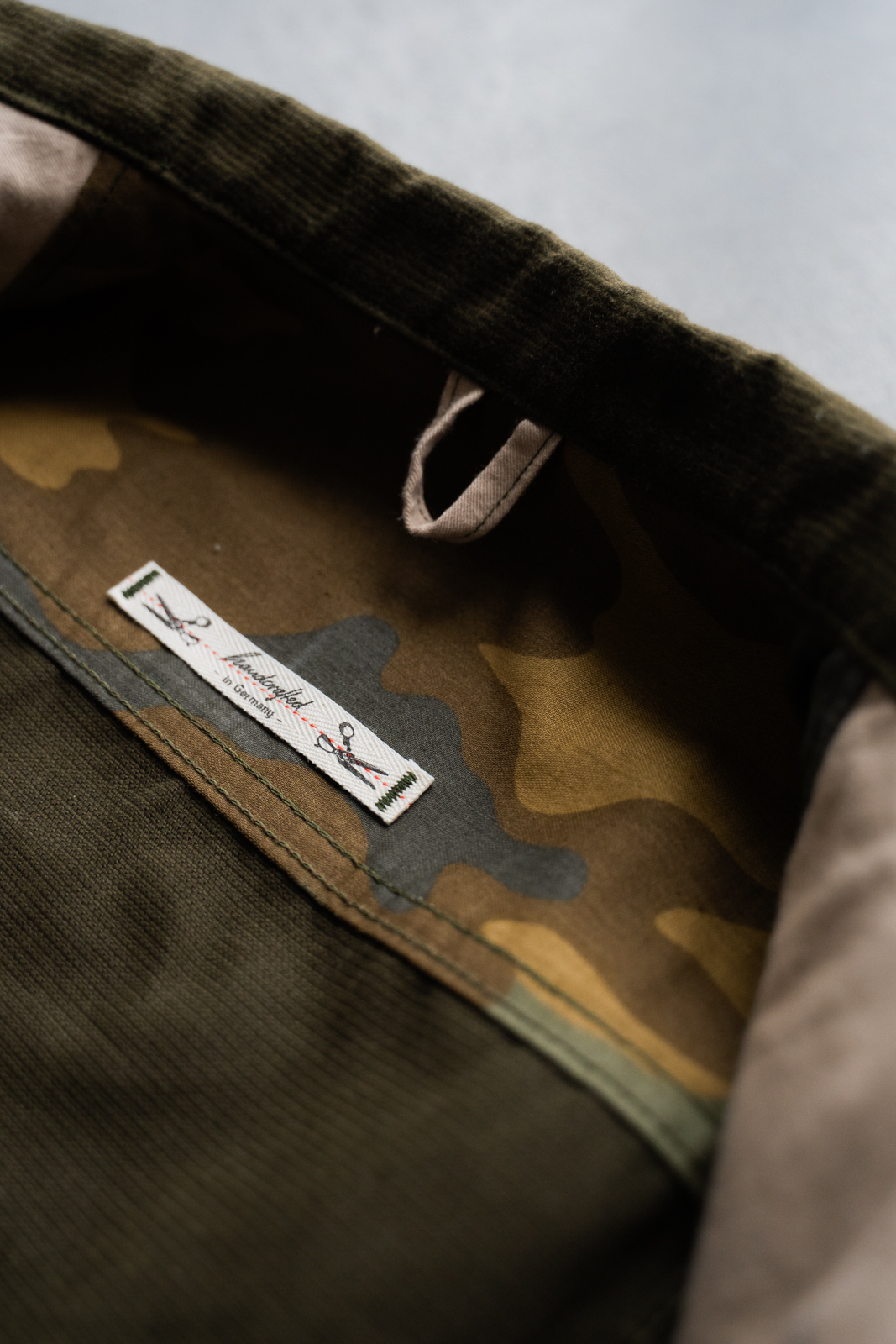 Diese Jacke aus grünen, soliden 15,6 oz Canvas ist eine starke Variante einer "Type 2" und ist mit den konstruierten Falten und den -mit ebenfalls starken Camouflage Köper gefütterten- drei aufgesetzten Taschen ein absolut zeitloses und schönes Design. Der Canvas ist winddicht und durch seine enge Webart gut wasserabweisend. Neben der versteckten Innentasche -ausgestattet mit dem signifikanten, handgestickten Emblem-, ist der Camouflage Köper auch als verstärkendes und verzierendes Element in der kompletten Innenverarbeitung eingearbeitet. Das taillierte Rückenteil und die Elemente zur Anpassung des Bundes sorgen für eine hervorragende Passform.